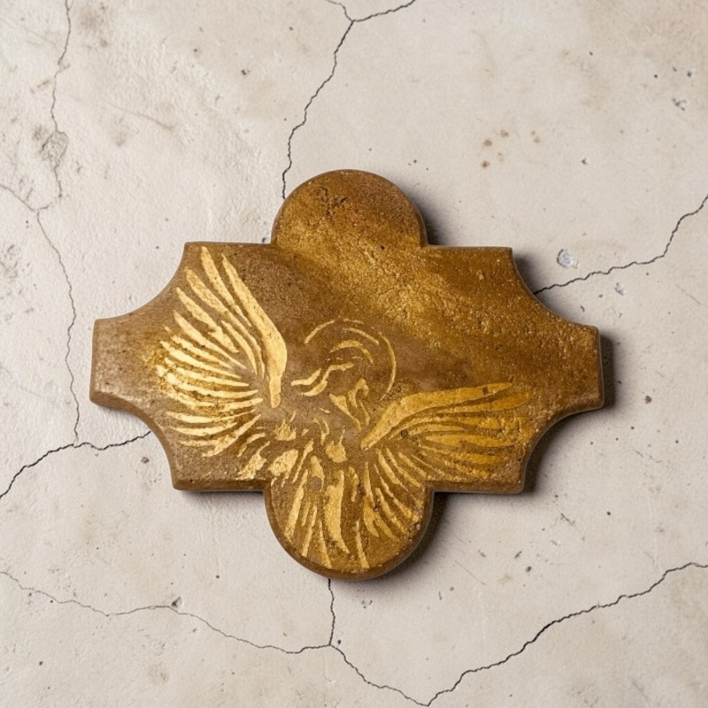 Rusztikus hatású beton edényalátét bronz-arany festett díszítéssel.